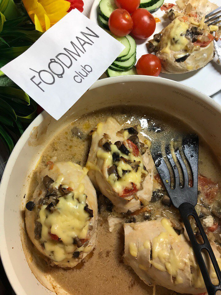 Чтобы куриная грудка не была сухой, приготовьте ее по этому рецепту. В качестве начинки будут помидоры с грибами. За 15 мин до готовности добавим сыр.