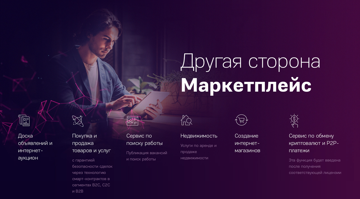 Они назвали это - маркетплейс и коммуникационная P2P-платформа. В него входит всё что можно представить здоровому человеку, я сейчас на полном серьезе.