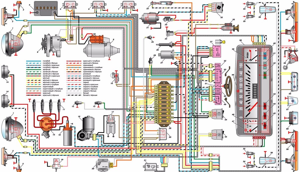 1 – фары; 2 – передние указатели поворота; 3 – боковые указатели поворота; 4 – аккумуляторная батарея; 5 – реле контрольной лампы заряда аккумуляторной батареи; 6 – реле включения ближнего света фар; 7 – реле включения дальнего света фар; 8 – генератор; 9 – стартер; 10 – подкапотная лампа; 11 – свечи зажигания; 12 – датчик контрольной лампы давления масла; 13 – датчик указателя температуры охлаждающей жидкости; 14 – звуковые сигналы; 15 – распределитель зажигания; 16 – моторедуктор стеклоочистителя; 17 – датчик контрольной лампы уровня тормозной жидкости; 18 – катушка зажигания; 19 – электродвигатель омывателя ветрового стекла; 20 – регулятор напряжения; 21 – электродвигатель отопителя; 22 – лампа освещения вещевого ящика; 23 – добавочный резистор электродвигателя отопителя; 24 – штепсельная розетка для переносной лампы; 25 – выключатель контрольной лампы стояночного тормоза; 26 – выключатель сигнала торможения; 27 – реле-прерыватель укзателей поворота; 28 – выключатель света з