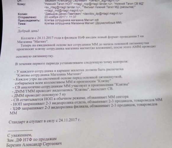 Промелькнуло как-то так же по осени в новостях лайфа-как нижнетагильского товароведа магнита, находящегося-внимание-в декрете! хотят уволить за то, что опубликовала в одноклассниках клятву сотрудника, видели наверно, эту бумажку уже где-нибудь в сети. В этой новости было прекрасно все-и замысел этой замечательной инициативы клятвы (жаль, не предусмотрена подпись кровью), и распоряжение ЗДФа внедрить эту инициативу массово без согласования (вот это уровень заместителя директора филала по продажам) и попытка уволить находящуюся в декретном отпуске сотрудницу-тоже явно с руки новатора, и это-то на фоне некоторых оптимизаций (читай сокращений не по закону) в связи с падением курса акций. Вот это, я так понимаю, настоящий срез, так сказать, уровня некоторых ( опять читай-многих) "руководителей" Магнита.
