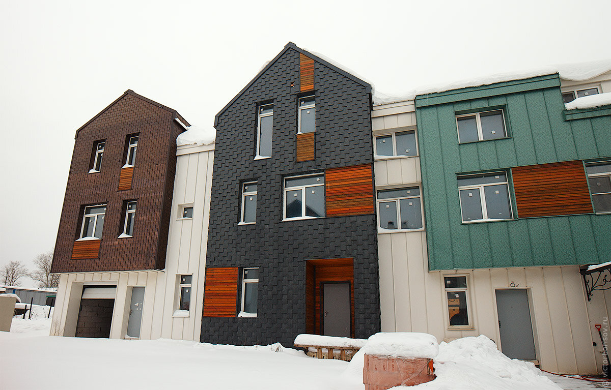Таунхаусы посёлка «Бремен» построены в стиле одноименного немецкого города, известного всем с детства по мультфильму «Бременские музыканты». Это трёхэтажные таунхаусы с монолитным каркасом и заполнением из газобетона Ytong. Наружная облицовка сделана из оцинкованного металла и сланцевой черепицы.
