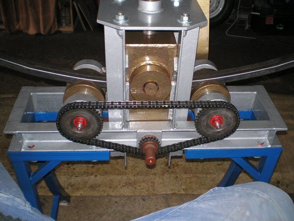 Трубогиб предназначен для придания трубе или профилю определенной конфигурации и изгиба различного градуса. Применяется как на профессиональном производстве, так и в частных мастерских. С помощью трубогиба изготавливаются различные металлоконструкции нестандартной формы, так к примеру арки, каркасы теплиц, детали рам и остовов техники, козырьки, а так же станки данного типа активно эксплуатируются в кузнечных мастерских. Так же применяется и для создания самодельной техники, а именно рам вездеходов, мотовездеходов, багги, и т д. Трубогиб состоит из рамы сваренной из швеллера и системы вальцов 2 из которых постоянно находятся в одном положении, а третий при помощи инструментальной резьбы перемещается вверх или вниз, тем самым прижимая заготовку и задавая определенный угол при прокате. Уникальность такого станка в том, что практически все детали взяты по сути из металлолома, что в очередной раз говорит о бюджетности конструкции. Автор представленного трубогиба щедро поделился чертежам
