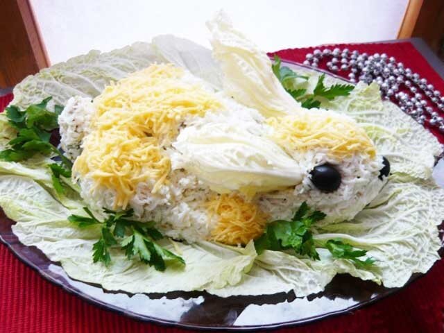 На праздничный стол можно приготовить такой вот аппетитный и вкусный салатик. Он не только будет объедением, но также и будет украшением вашего стола. Ингредиенты: Приготовление: 1. Берём отварное куриное мясо и нарезаем кубиками. 2. Мелко нарезаем лук. 3. Огурцы также нарезаем как мясо, кубиками. 4. Далее берем варенные яйца и отделяем желтки от белков. Желтки нарезаем кубиками и отправляем в тарелку к остальным ингредиентам, а белки натираем на тёрке, они понадобятся для украшения. 5. Половину сыра натираем на крупной терке - это пойдет на салат, а остальную часть сыра на мелкой терке - это пойдет для украшения. 6. Далее все ингредиенты для салата заправляем майонезом, добавляем соль по вкусу и как следует все перемешиваем. 7. Готовый салатик укладываем на листья салата, формируя кролика. 8. С помощью белков делаем шубку кролика. Из оставшегося сыра делаем пятнышки, глазки и носик делаем с помощью маслин, а из пекинской капусты - ушки. Вот и все! Салат "Пасхальный кролик" готов!