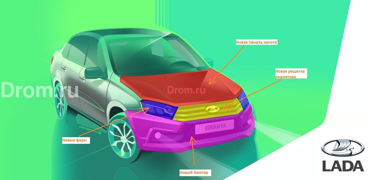 В распоряжение портала Drom попали эскизы грядущей новинки. Если смотреть по деталям, обновленная «Гранта» будет отличаться новыми панелью капота, передним и задним бампером, решёткой радиатора, а также фарами. А вот передние и задние крылья останутся старыми. Модернизация также затронет салон — там появится новая панель приборов. Ранее сообщалось, что «Калина» как отдельный вазовский бренд, скорее всего, прекратит своё существование. В свою очередь, все модели на платформе «Калина/Гранта» станут называться Lada Granta: седан, универсал, лифтбек и, возможно, хэтчбек. Последний может вообще исчезнуть из модельной линейки Lada.
