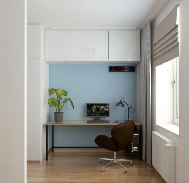 В данном проекте представлена трехкомнатная квартира, где две комнаты отданы под детские. Оставшаяся комната совмещает в себе гостевую зону, спальню и кабинет.Это комната родителей - 17 кв.м. Спальное место от основного пространства отделяет плотная штора в пол. Рабочее место находится у окна и выделено голубым цветом. Общая цветовая гамма светлых тонов. Белые шкафы вдоль стены сливаются с потолком и практически не различимы. Кухня также поддерживает светлую цветовую гамму квартиры. Белый кухонный гарнитур с навесными шкафами до потолка для экономии пространства. Фартук над рабочей зоной выполнен из той же плитки, что и на полу. Две детские для мальчика и девочки. Одна в спокойных голубых тонах, другая с акцентами на зеленом и желтом цвете. Потолки декорированы балками из сосны. Для отделки ванной комнаты использованы белый и черный мрамор. Так как в квартире нет гардеробной, вдоль одной из стен в коридоре встроен шкаф-купе под потолок. Деревянные рейки слева от входа разделяют зону п
