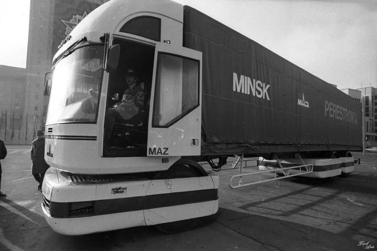Прототипом магистральных грузовиков были МАЗы 2000 Перестройка от 1988 года. Их отличительной чертой являлась оригинальная модульная конструкция. Почти все агрегаты располагались в передней части автомобиля. При необходимости замены двигателя, коробки передач, ведущего моста и рулевого управления, неработающий агрегат заменялся аналогичным. Благодаря этому автопоезд мог быть построен с любой длиной и грузоподъёмностью. На осенний период 1988 в Парижских автомобильных салонах такие конструкции были довольно высоко оценены. Однако производить такие прототипы не стали, и на это были свои причины. Техническими характеристиками были длина в 14,9 метров и масса порядка 33 тонн, а также возможность развивать скорость порядка 120 километров в час. Белорусский автозавод создал автомобиль, который за всю историю существования, вызвал наибольший резонанс и привлек к себе всеобщее внимание. Это было создание грузовика МАЗ-2000 Перестройка. Такая конструкция представляла собой в то время символ св