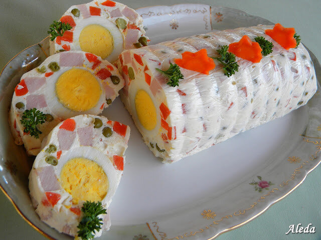 Не один праздничный стол не обходится без салатов, привычных и не очень. Предлагаем вашему вниманию необычный салат-желе из привычных продуктов. На столе смотрится ярко, празднично. Вам потребуется: зеленый горошек 200 г, морковь отварная 200 г, картофель отварной 2 - 4 шт, ветчина 200 - 250 г, яблоко (некрупное) 1 шт, яйцо вареное 5 шт, горчица 1 ст. ложка, сметана 3 ст. ложки, сок лимона по вкусу, майонез 5 ст. ложек, бульон овощной 200 мл, желатин 20 г, соль и черный молотый перец по вкусу. Очищенные отварные овощи и яблоки нарезаем небольшими кубиками. Нарезанные яблоки обязательно поливаем лимонным соком.В большой емкости соединяем порезанные овощи, яблоки, зеленый горошек и ветчину. Все хорошо перемешиваем, добавляем соль и черный молотый перец. Готовим соус: Желатин предварительно заливаем холодной водой. Разбухший желатин растворяем в овощном бульоне и оставляем до полного остывания. В отдельной посуде смешиваем майонез, сметану, горчицу. Полученную массу солим и перчим по с