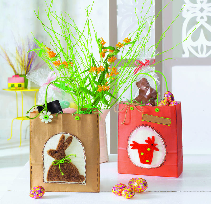 В такой пакет можно положить пасхальные подарки, например, угощения. Понадобятся простые прямоугольные крафтовые пакеты, нитки, помпоны для «хвостиков». У каждого пакета сверху вырежьте «ушки». Приклейте «хвостики». Положите подарок в пакет, завяжите его, добавьте этикетку — нарисовать её можно самостоятельно.