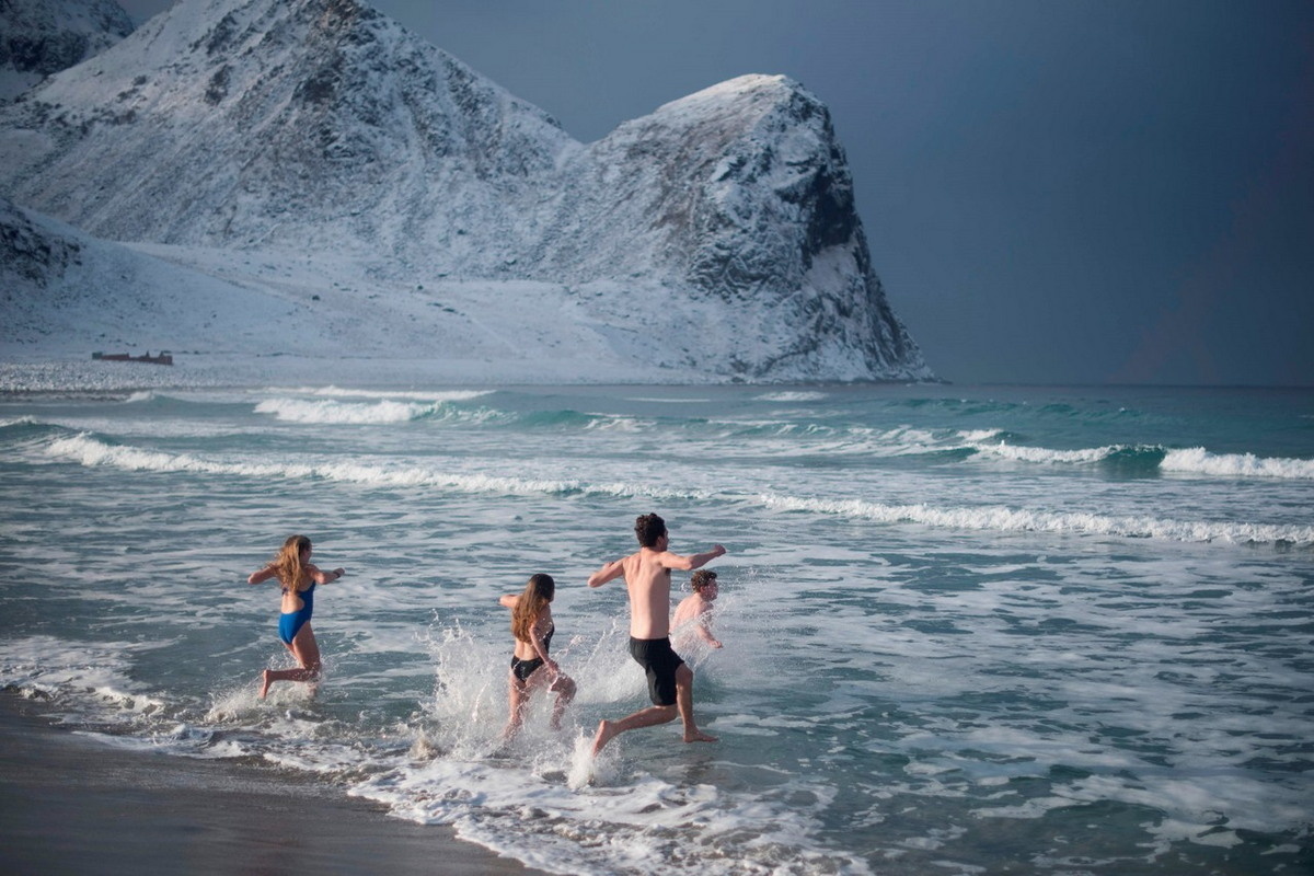 В северной части Норвегии есть замечательное место - Лофотенские острова. Уже очень много лет подряд они вызывают постоянный интерес туристов со всего мира! Природа здесь настолько эпична и красива, что всегда вызывала восхищение у многих творческих людей. Островам посвящались литературные произведения, художники рисовали картины. А некоторые туристы приглядели себе пляж на островах. Это же прекрасно, когда вокруг температура воздуха всего минус пять, а температура воды +5. Что ж не искупаться и в самом деле? А такие смельчаки нашлись и, судя по фото ниже, они довольны на все сто! Оцените размах природы Лофотенских островов в небольшой видеозарисовке. Это завораживает необычайно!