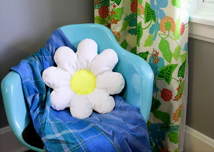 Из этого пошагового мастер-класса вы узнаете, как сшить декоративную подушку в детскую своими руками. Урок будет очень простым и понятным, а материалы – доступными. В конечном итоге у вас получится яркая и красивая мягкая ромашка, которая понравится любому ребенку. Советуем шить сразу несколько подушек за один подход – так у вас на кровати «расцветет» целая поляна ромашек. Кстати, никто не мешает вам заменить привычный окрас этого цветка и сделать ее красной, радужной или и вовсе в горошек. Шить декоративные подушки мы будем по выкройке. Так что если вы за один раз делаете только один аксессуар для детской, не выбрасывайте заготовку – позже она может вам пригодиться, когда решите сшить еще одну подушку. Смотрите также: простая подушка в спальню Что нам понадобится? Ткань для пошива декоративной подушки можно использовать почти любую, однако лучше всего избегать синтетических тянущихся материалов и того, что осыпается при работе. Оптимально взять что-то натуральное – хороший хлопок, лен