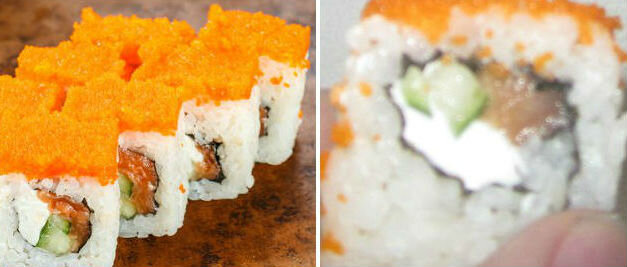 Я выбрала злосчастные роллы с икрой и Калифорнию. Причем последние я, для надежности, приправила"Доместосом", так как признаюсь, у меня не было доверия к честности экспертизы.