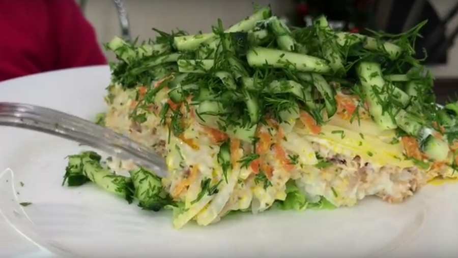 Беспроигрышный вариант, если Вы приготовите этот салат на каждый день или на званый обед. В приготовлении он не сложный, но вкусный, а оригинальность в том, что этот салатик в шутку называют «три в одном»: гарнир, рыба и салат. Необходимо взять: