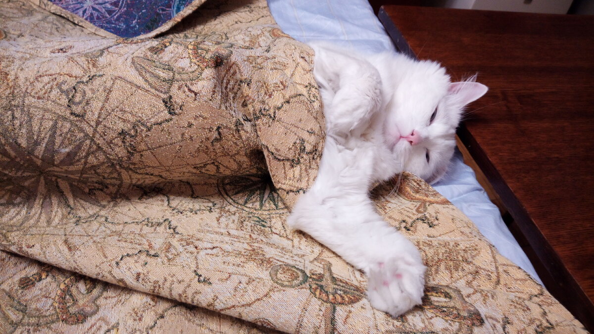 Привет от кота Барсика! Наконец-то определена самая полезная поза для сна... По китайскому поверью мудрецы спят на левом боку, цари — на правом, грешники — на животе, а на спине — святые. — Интересно...интересно, ща проверю, так сказать, теорию на практике... иду спать на левом боку...А-а-ха-а-а-а — зевнул Барсик и быстро заснул. — Ох, ты ж ёшкин кот, как хорошо поспал-то... ощущаю себя наимудрейшим мудрецом, умудрённым наимудрейшей мудростью... на которого напал страшный жор. — Так, по-быстрому, поем и продолжу сно-эксперимент — пойду спать на правом боку... — Где моя царская постель??? Что-то сна ни в одном глазу, интересно, во сколько цари спать ложатся? Пойду, побегаю, сон набегаю... потом ещё поем... ещё побегаю, ещё поем... А вдруг цари вообще не спят? Пожалуй, лягу, если не усну, так хоть полежу как царь... хр-р-р — захрапел Барсик, почти сразу, как только улёгся на правый бок. Поспал, проснулся, потянулся, повернулся, подумал: — Царь поспал — можно и поесть... — Где моя ц
