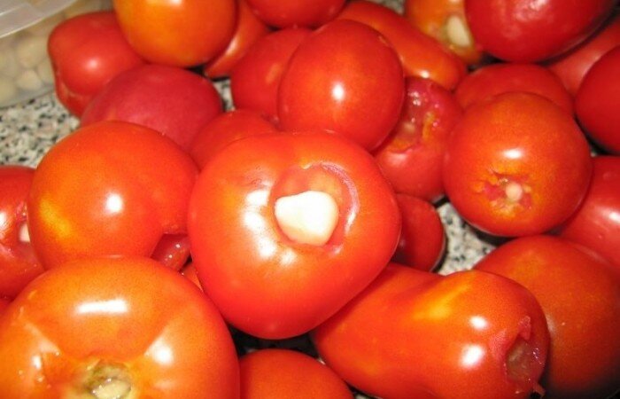 Представляем вам отличный рецепт заготовки помидор. Получаются они кисло-сладкие. Наши помидорки не нужно стерилизовать. А в чем сюрприз? В том, что в каждую помидорку мы спрячем дольку чеснока. Необходимые продукты Специи на 1.5 литровую банку Для маринада Начинаем приготовление А еще мы рекомендуем вам попробовать засолить помидоры в собственном соку. Рецепт такой маринации есть на сайте «Идеи рецептов».