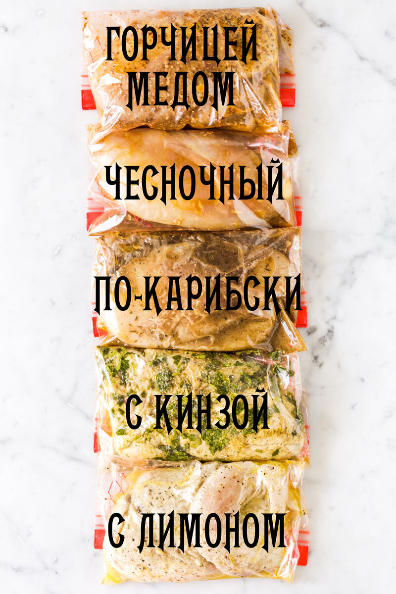 Сегодняшний пост для тех, кто экономит свое время и следит за качеством питания. Если у вас мало времени для готовки, а питаться на ходу – не для вас, то предлагаю вам вот такой выход: делайте заготовки. Всем известно, что куриная грудка – это один из лучших диетических источников белка. То, что нам надо! Ее и будем заготавливать на неделю вперед. Я хочу предложить вам 5 разных способов замариновать куриную грудку. Мясо грудки не самое сочное, но с этой проблемой прекрасно справится маринад. Для хранения заготовок я использую герметичные пакеты – для меня это самый лучший и удобный способ на сегодняшний день, хотя, может, и не самый экологичный. Замаринуйте куриные грудки и храните их в морозильнике. За несколько часов до приготовления достаньте грудку из морозильной камеры, дайте ей полностью оттаять и только потом готовьте. Что касается меня, то я готовлю мужу на обед куриные грудки с гарниром (это могут быть овощи на пару, киноа или гречка), соответственно оставляю грудку на ночь