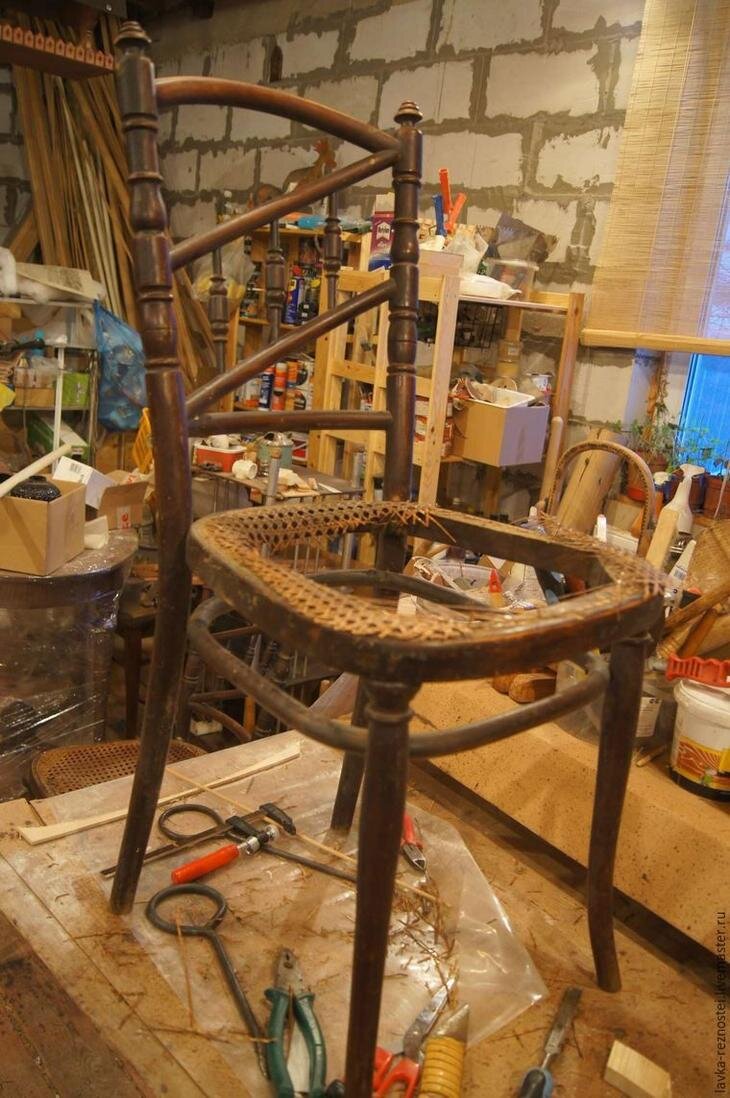 Для этого по размеру шканта подобрано сверло, высверлено отверстие в ноге и царге стула, вставлен по размеру шкант (в том месте, где ранее был шуруп) и вся конструкция быстро собана на клей ПВА. Следующий этап — снятие старого лакокрасочного покрытия. О нем я подробно рассказывала ранее и не буду тут останавливаться.