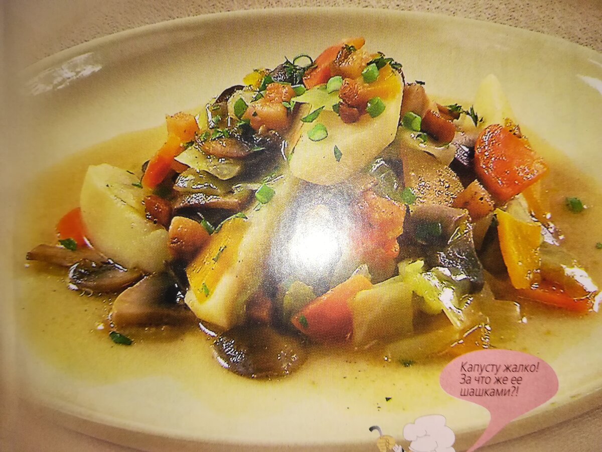 Ингредиенты на 4 порции: Грибы 500 гр. Картофель 4 шт. Белокочанная капуста 1/4 кочана Репа 1 шт. Морковь 1 шт. Шпик 100 гр. Корень петрушки 1 шт . Вода 1/2 литра Перец черный молотый по вкусу Способ приготовления: 1.Грибы,морковь,репу и корень петрушки нарезать ломтиками,картофель желательно нарезать дольками и капусту также. 2. Шпик нарезать кубиками, обжарить их до хрустящего состояния. 3. Обжарить грибы и коренья до полуготовности вытопившимся жире от шпика и уложить в горшочки. 4. Влить в горшочек горячую кипяченую воду,добавить капусту, репу и картофель. Посолите и поперчите по своему вкусу и тушить до готовности . Время приготовления составляет 35-40 мин. При подачи грибочков с овощами не забудьте посыпать шкварками, нарезеной петрушкой и зеленым луком . Приятного аппетита!
