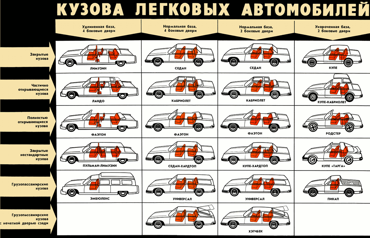 Легковые кузова автомобилей бывают: Лимузин - закрытый четырехдверный кузов с двумя или тремя рядами сидений . После переднего ряда сидений стоит подъемная перегородка, для отделения водителя от пассажиров. Пульман- лимузин - закрытый четырехдверный кузов , разновидность лимузина, после переднего ряда сидений стоит подъемная перегородка, имеющая три ряда сидений, задние ряды располагаются один напротив другого Стретч - закрытый кузов, главное отличие - врезка в кузов дополнительной секции, расположенной между передними и задними дверьми, что способствует удлинению салона. Седан -закрытый четырехдверным кузовом с двумя рядами сидений . Седан имеет наибольшее распространение на легковых автомобилях. Лифтбэк – закрытый кузов , промежуточный между седаном, универсалом и хетчбеком. От хетчбэка он отличается большей длиной заднего свеса: у лифтбэка он по длине такой же, как у седана. Задняя часть крыши при этом может быть покатой и ступенчатой, напоминающей седан. Отлич
