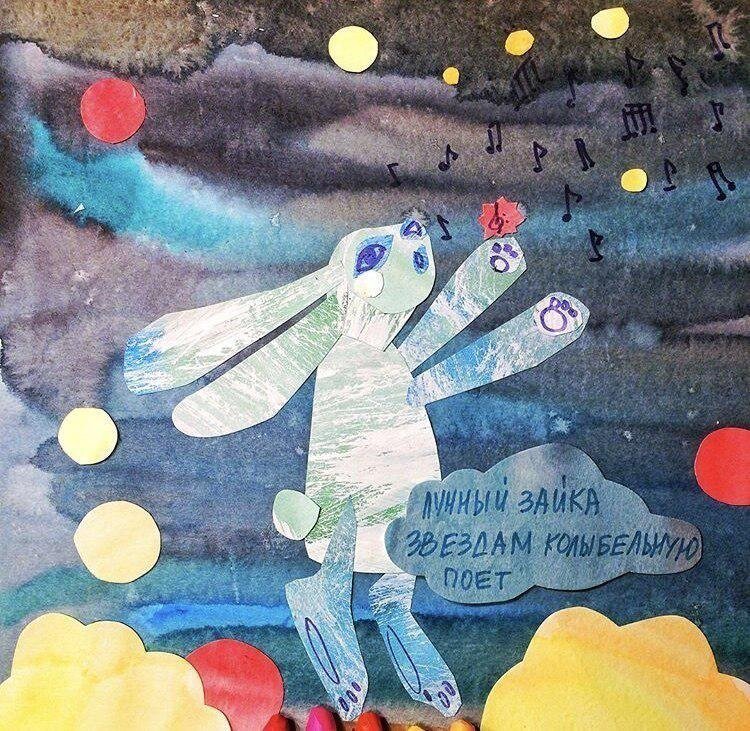 Детские аппликации из кусочков раскрашенной бумаги.