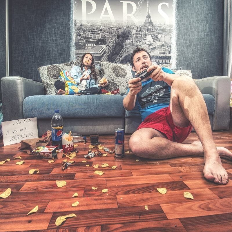 Каждая женщина немного нервничает, когда ей приходится уезжать и оставить вдвоем мужи и ребенка. Ведь мужчина – тот же ребенок. А что могут натворить двое детей? Правильно, как минимум разгромить всю квартиру, не питаться правильно, смотреть телевизор до ночи и много еще чего может взбрести в эти две головушки. Наверное, именно такие мысли посетили жительницу Тюмени, когда ей пришлось отправится в командировку и оставить мужа и меленькую дочку на несколько дней. Но ее муж Марат, будучи фотографом, решил не нервировать жену и задумал фотопроект, целью которого было сохранить спокойствие жены. Каждый день они с дочерью делали фото с табличкой, на которой было написано «Мама, у нас все хорошо!». Чувство юмора у Марата оказалось на высоте, остается только надеяться, что жена его тоже оценила, а не получила ранний инфаркт. Отец и его семилетняя дочь решили показать маме, как они проводят время в ее отсутствие Как они развлекаются во время домашних дел… Как они поддерживают чистоту в доме