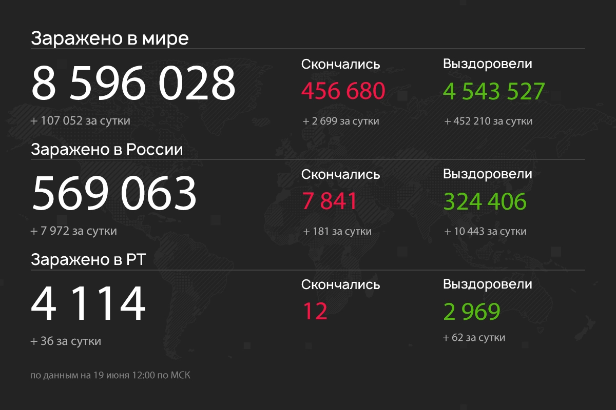 За последние сутки в России выявлено 7 792 зараженных коронавирусом в 83 регионах, в том числе 38 новых случаев в Татарстане. Об этом сообщает оперативный штаб по борьбе с инфекцией. Всего в стране зарегистрирован 561 091 заболевший в 85 регионах. Отмечается, что 31,5% новых случаев выявлено у контактных лиц без клинических проявлений болезни. В Москве отмечается самое низкое за два месяца число новых случаев коронавируса — 1040 человек. Среди регионов с наибольшим числом заболевших за сутки оказались Подмосковье (667), Ханты-Мансийский автономный округ (243), Нижегородская область (233), Санкт-Петербург и Свердловская область (по 231). А также вакцина против COVID-19 введена первым 18 добровольцам в госпитале Бурденко. Побочных реакций или осложнений не зафиксировано, сообщили в Минобороны;