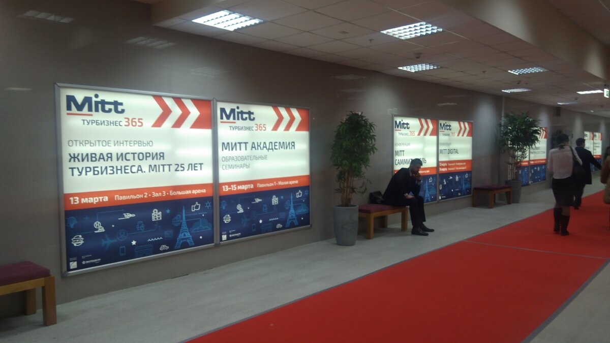 Немалозначимо, что происходит вокруг конструкций, какое оформление. Сложность в Экспоцентре в том, что там на площадке своя очень навязчивая и пёстрая навигация сине-оранжевого цвета. Она не очень приятно сочетается с макетами выставок. В случае с MITT это было не очень критично, так как синий паттерн сочетался с синими элементами навигации Экспоцентра и выглядел даже их частью.
