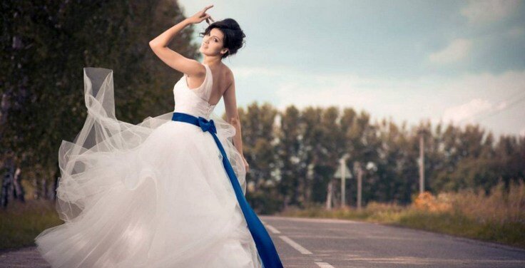 Показать свою индивидуальность, отойти от общепринятых шаблонов, ярко и оригинально выразиться и при этом не перегнуть палку и остаться в классических рамках бракосочетания. Задача, которую ежедневно ставят перед собой сотни влюблённых пар, готовящихся к свадьбе. Каждая из них идет своим путём. Одни проводят мероприятие окружив его антуражем определённого стиля. Другие организовывают выездную регистрацию брака. Третьи экспериментируют с форматом самого действа. Наиболее осторожные не пытаются как-либо перестроить стройное течение общепринятых обычаев и ритуалов и выделяются через собственную индивидуальность: наряды, украшения, дополнения. Так, например, подвенечный наряд. Традиционно он носит светлый оттенок. Можно ли здесь что либо придумать, чтобы оно, ярко выделялось от других подобных в ЗАГСе, где в единицу времени можно повстречать сразу несколько принцесс в подвенечном наряде? Одно из нетривиальных решений — синие элементы на свадебном платье. Синие элементы на свадебном платье
