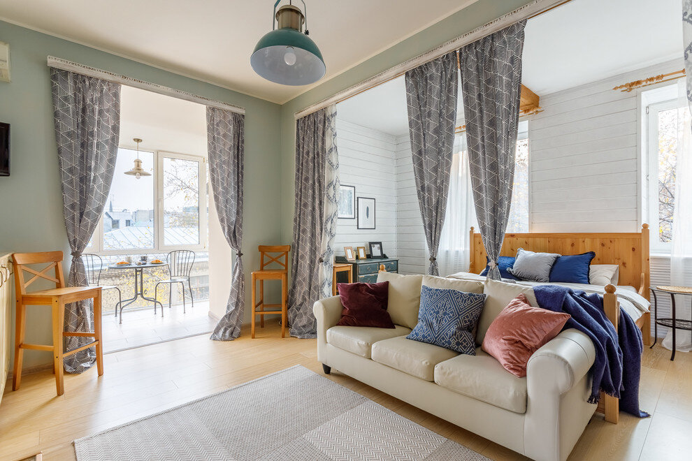 Однокомнатная квартира и раньше была разделена на две зоны – спальню и гостиную. Теперь пространство зонируют не только выступы на стенах и потолке, но и шторы, ткань для которых подобрали в «Леруа Мерлен» и ИКЕА.