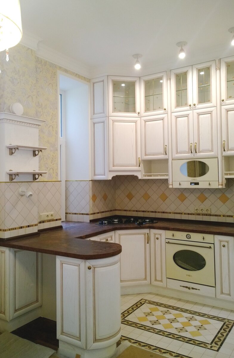 Никогда бы не подумала, что кухня в хрущевке может быт НАСТОЛЬКО шикарной. Кажется, будто находишься в загородном доме, а не в обычной городской квартире. Размеры кухни 2,2*2,8*1,7 Дизайнер Татьяна Ефремова придумала и реализовала этот проект. Давайте его посмотрим повнимательнее и увидим все его плюсы и минусы. А также поймем, за счет чего удалось реализовать такую красоту. 1. Классика всегда в моде! Чтобы кто не говорил, а классическая кухня вряд ли вам надоест. Она всегда смотрится свежо, ярко, интересно. 2. Для достижения ощущения простора пришлось частично снести стену между гостиной и кухней. Вход в кухню сделали через комнату. Такое расположение позволило поставить холодильник на кухню. 3. Одинаковая плитка на полу и на фартуке На полу и фартуке выложена одинаковая плитка бежевого, желтоватого и коричневого цветов. Межплиточные швы затерты серой затиркой. На полу рисунок выложен, как ковер. Такое сложное сочетание относит нас во времена царей и императоров. 4. Встроенная