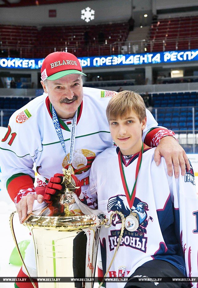 В начале апреля Николай Лукашенко, младший сын президента страны, вместе со своей командой «Грифоны» выиграл хоккейный турнир «Олимпийские надежды». За последние месяцы это не первый крупный спортивный успех Николая, который зажигает не только с клюшкой, но и на лыжах с винтовкой. Серебряный призер «Золотой шайбы» В начале января Николай с «Грифонами» бился в финальной стадии «Золотой шайбы». Матчи детских соревнований проходили на «Чижовка-Арене» параллельно с играми «Рождественского турнира», в котором участвовал Александр Лукашенко. Президент выиграл кубок, а его сын остановился в шаге от трофея – дотянуться до него не позволила команда «Медведь» из Московского района Минска, победившая 4:3. После церемонии награждения участников финала «Золотой шайбы» глава Беларуси сделал фото со своим сыном на память. Лучший бомбардир «Золотой шайбы» Николай кубок не выиграл, зато стал главным снайпером состязаний, набрав 16 результативных баллов (10+6). Дебют за команду президента Перед игрой с