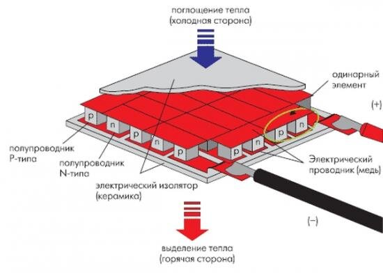 Они давно используется в автохолодильниках, компьютерах, бытовой электронике, но там их используют в основном для охлаждения, а выработка электроэнергии является побочным явлением. Теперь элементы Пельтье используют для выработки электроэнергии за счёт разности температур между двумя боками пластины.