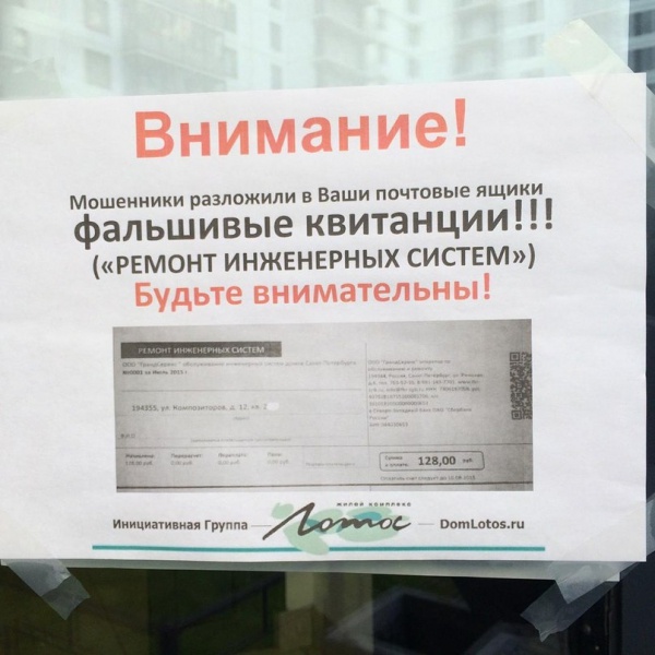 Наступила весна и значит началась пора капитальных ремонтов в подъездах сотни тысяч домов России ! Но вместе с подснежниками просыпаются и мошенники !!! Истории первых больших афёр с ЖКХ берут своё начло уже с 2015 года ! Вы представляете масштаб АФЁРЫ которая уже как 3 ГОДА прогрессирует и улучшается с каждым днём , всё лучше и лучше... Молодое поколение с помощью сми и различных гаджетов , лучше информирована , нежели наши бабушки и дедушки, которые к большому сожалению , не разбираются ни в гаджетах ни в интернете... А это значит , что именно они находятся под большой угрозой обмана! Как осуществляется афера: Делаются очень хорошие копии бланков ЖКХ , что обычному глазу не сразу видно.Разносят (в подъезды) поддельные платежные квитанции за капремонт со ссылками на документы, обязывающими заплатить взнос. Внешне очень похоже на обычную квитанцию, но в ней допущена незаметная опечатка. В итоге вместо того, чтобы платить взносы в "Фонд капитального ремонта", жители будут от