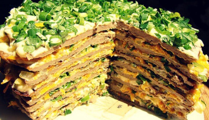 Женщины и дети любят сладкие торты, а вот большинство мужчин любят мясо. Поэтому специально для них мы решили познакомить вас с этим замечательным рецептом торта. Это блюдо может стать отличным украшением праздничного стола. Украсить его можно зеленью, грибами или любыми другими овощами на ваш вкус. Необходимые продукты Начинаем приготовление Еще одна отличная закуска к праздничному столу – «слойки-мешочки». Рецепт их приготовления есть на сайте.