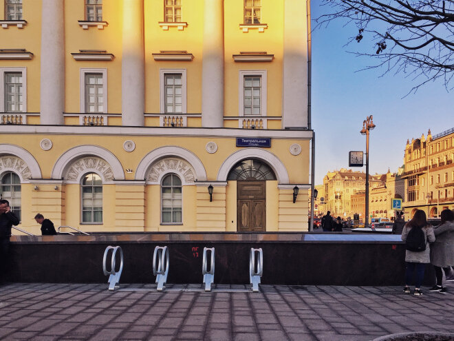 Вообще-то велопарковки самые обычные. Всё решает их местоположение. Долгой и темной московской зимой Департамент капитального ремонта (ДКР) не спал. Как только растаяли сугробы, на улице Петровке обнаружились новенькие велопарковки. Прошлым летом Петровку реконструировали по программе “Моя улица”. Должны были сделать велополосы и даже заложили их в ширину улицы, но испугались гнева защитников прав автомобилистов и передумали, так что теперь ширина двухполосной улицы составляет больше восьми метров. Отсутствие велополосы ДКР решил компенсировать велопарковками. Они установлены на улице в количестве 52-х штук. Места для них выбирались как на подбор. Эти четыре стойки располагаются недалеко от Малого театра. Ими смогут пользовать и зрители Большого, где велопарковок нет, а зря — лидер проекта Let’s bike it! Владимир Кумов большой любитель балета. Идём дальше — до бутика Bulgari, где находится следующая велопарковка. Bulgari — римский часовой и ювелирный дом, его украшения очень любила Эли