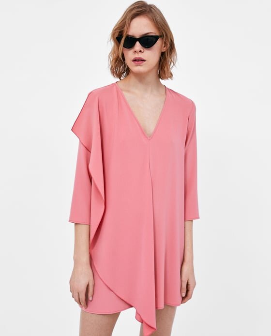 Привет, девчонки ) Все уже смотрели новую коллекцию Zara? Мой наметанный глаз сразу же определяет удачные модели для пышечек. Zara, конечно, не специализируется на этом, но размеры L, XL у них имеются. Кто будет называть их платьями, кто туниками - решайте сами. Если мини длина вас устраивает - пусть будет платье, если нет - носите как тунику :) Про платья, скрывающие живот и бока я писала тут. Конечно, же все эти модели подойдут и стройным девочкам. Поехали? :) 1. Зефирные воланы. Очень красивая туника снова с V-образным вырезом.