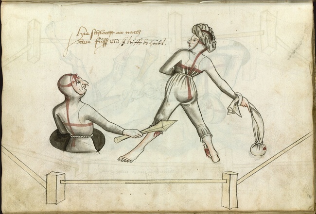 В Средние века в Германии муж и жена при улаживании спора могли обратиться к супружеской дуэли. Такой жесткий способ разрешения конфликта имел свои правила. Мужчине надлежало находиться по пояс в яме, одна его рука должна была быть привязана к телу, а в другую он мог взять дубинку. Женщина могла передвигаться в пределах четко ограниченной территории. В качестве оружия она использовала мешочек с камнями. Суды над животными В Средние века суды устраивались не только над людьми, но и над животными. Чаще всего в качестве подсудимых оказывались домашние кошки — их обвиняли в колдовстве; коровы, куры (в частности, петух, который снес яйцо) и свиньи. Например, на этой гравюре вы видите свинью, которую признали виновной в убийстве ребенка. Суд не смущал тот факт, что