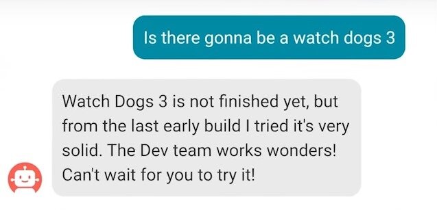 Компания Ubisoft уже в третий раз дает подсказку игрокам, что Watch Dogs 3 находится в разработке. Но, на этот раз был дан явный ответ. Напомним, что до этого был намек в официальном твиттер аккаунте второй части, затем первоапрельская шутка со взломом Uplay в стиле Watch Dogs, теперь же у нас есть более весомая причина верить, что выход третей части не за горами. В начале текущего года компания выпустила виртуального помощника SAM, который пока находится в тестовом режиме и доступен только в Канаде. Роль SAM - помогать игрокам ориентироваться в сервисах компании и давать подсказки. Один из пользователей задал помощнику прямой вопрос относительно разработки Watch Dogs 3, на что SAM дал прямое прямой неуклончивый ответ: "Разработка Watch Dogs 3 не закончена пока, но последний билд, в который мне удалось поиграть, выглядит вполне солидно. Работа команды разработчиков на высшем уровне! Жду не дождусь, пока ты не попробуешь это!" Таким образом у нас есть официальное подтверждение того,