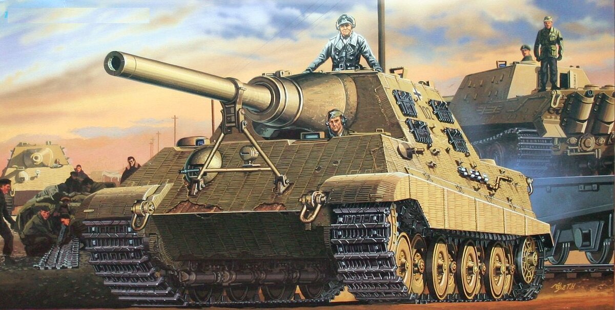 Ягдтигр – яркий представитель семейства «тигров». История этого истребителя танков начинается вместе с историей «Королевского тигра». Разработка одной из самых мощных САУ своего времени началась после прямого распоряжения Гитлера. Когда 20 октября 1943 года первый макет, сделанный из дерева, представили главе Третьего Рейха, тот пришел от него в восторг. Тут же был сделан заказ на изготовление 100 моделей. Изготовление первой реальной моделей занялись две немецких компании: Порше и Хеншель. И несмотря на то, что Порше первыми изготовил легкую и простую в производстве модель, Хеншель через интриги в итоге смогли получить главный заказ себе, хотя их модель была откровенно «сырая». И так, к началу февраля 1944 года было изготовлено первые 12 моделей, как оказалось это максимум, который может производить германская промышленность. Ведь заводы Хеншель уже давно подвергались бомбардировкам, да и было огромное количество других заказов. Так что в итоге удалось выпустить всего 79 моделей.