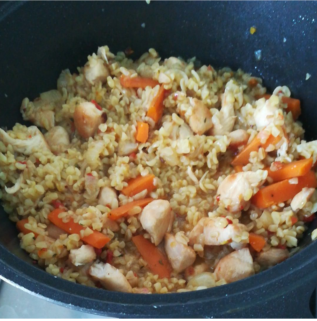 Недавно я открыла для себя новую крупу БУЛГУР, все ходила я мимо нее и ходила, не решалась купить. Но потом была акция и я подумала, ладно попробую. Долго она лежала у меня в ящике с крупами и как то я наткнулась на нее, не знав что приготовить. На вид она как рис, и думаю приготовлю ПП плов. Обжарила куриную грудку с овощами и засыпала крупу, далее залила водой и закрыла крышку, томилось это все у меня на ниже среднего огня минут 25-30. Запах у этой крупы приятный, а на вкус.... Теперь это моя самая любимая крупа, и думаю что же я раньше мимо нее ходила и не решалась попробовать. Крупа выглядит как рис а на вкус как перловка, ну очень вкусная. Если вы любите перловку, то обязательно ее попробуйте. Эта крупа очень полезная. Вот пример как можно ей поужинать! Булгур в виде плова, салат овощной и 1 яйцо. На такую тарелочку около 300 килокалорий. Сбалансированный ужин, есть и белки и жиры и углеводы, приблизительно в равных количествах.