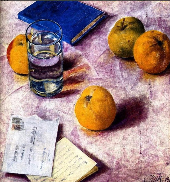 Чем больше я узнаю этого человека, тем большей симпатией проникаюсь. Кузьма довольно интересная личность, его авантюризм и решимость проявлялись на протяжении всей жизни и даже помогли жениться. Петров-Водкин. Начало. Провалив поступление в железнодорожный техникум в Самаре, он выдерживает экзамен в училище технического рисования барона Штиглица а Петербурге, а затем спустя два года Кузьма поступает в Московское училище живописи, ваяния и зодчества, где преподавал Валентин Серов! Далее последует признание Ильей Репиным, заграничные выставки, преподавание по собственной живописной методике... На этом повороты в судьбе художника не закончились. Из-за прогрессирующего туберкулёза, врачи запретили рисовать маслом и тогда Петров-Водкин взялся за перо: двадцать рассказов, двенадцать пьес, три повести. Однажды в одной из редакций, куда Петров-Водкин принёс свою поэму, встретился мужик, удивительно похожий на него самого. Большого роста, усатый, скуластый и точно так же наголо бритый.