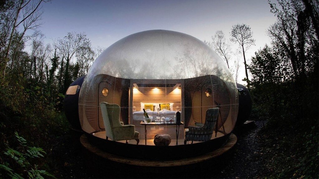 В Ирландии эко-отель Finn Lough предложил своим постояльцам, помимо традиционных коттеджей, новый вид размещения - в колбе посреди леса. При этом, в отличие от аскетичных номеров-саней для созерцания северного сияния в Финляндии, постояльцам в Ирландии не придется отказываться от удобств цивилизации: в номерах есть горячий душ и даже полы с подогревом. Finn Lough известен своими программами отдыха на природе: рафтинг, рыбалка, барбекю - вот это все. До сооружения лесных колб постояльцам приходилось "довольствоваться" обычными люксовыми коттеджами на берегу озера или сьютами рядом с теннисным кортом. Домики-пузыри позволят продлить впечатления от дневного отдыха на природе на темное время суток. В каждом пузыре - дизайнерская мебель, огромные кровати, отдельные ванные с горячим душом. Но часть ночи, определенно, должна пройти на надувной веранде с прозрачным куполом. Там установлены винтажные кресла, столик с кофеваркой и даже стильный телескоп. А вот WiFi в номерах нет - это бы нарушил