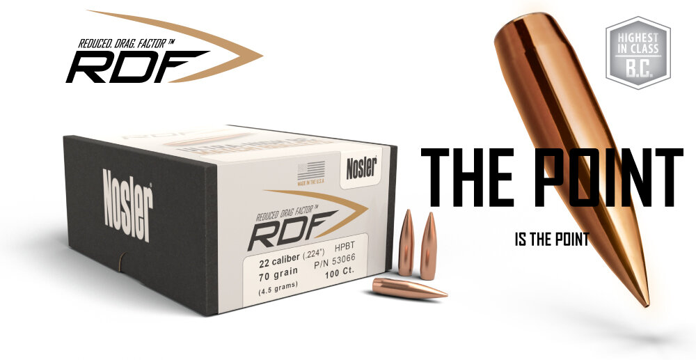 Nosler Inc расширяет линейку высокоточных пуль серии RDF (Reduced Drag Factor – с пониженным сопротивлением) четырьмя новыми моделями в калибрах .22; 6.5 мм; 7 мм и .30 с высоким баллистическим коэффициентом (БК), настильной траекторией и малым ветровым сносом. Обновление состоит из пуль: