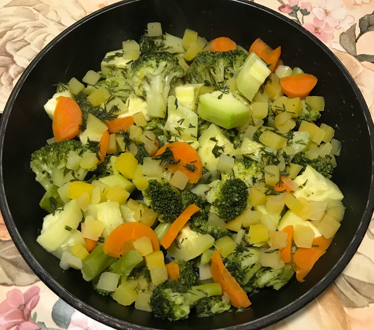 Этот гарнир не только радует глаз своими красками, но ещё и невероятно полезный и вкусный! Нам понадобится: Брокколи (замороженная или свежая) - 400 г Тыква (замороженная или свежая) - 200 г Кабачок - 200 г Морковь - 1 шт Зелень укропа и петрушки - по вкусу Соль - по вкусу Начинаем готовить: Брокколи разберите на небольшие соцветия. Тыкву нарежьте кубиками. Кабачок очистите и порежьте средними кусочками. Морковь очистите и порежьте полукружьями. Налейте в сковородку воду, слоем толщиной в палец. Поместите в неё овощи и поставьте на небольшой огонь. Овощи будут готовы, когда вода выкипит. Незадолго до завершения, нарежьте мелко зелень и добавьте в овощи. Перемешайте. Перед подачей полейте овощи оливковым маслом и припудрите куркумой. Приятного аппетита!