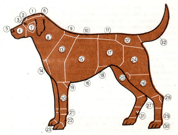 Голова. Основной породный признак собаки, вид и форма которого стойко передается по наследству. Голова рассматривается по величине, форме, длине черепной и лицевой частей морды, сухости и мясистости облегающей её кожи, в частности губ. Объем головы у различных пород неодинаков от тяжелой массивной головы с резко выраженными выступами черепа и массивной мускулатурой, которые присуще сенбернарам, кавказцам до легкой - сухой головы колли, добермана. Голова состоит из черепной и лицевой части морды. «Мордой»- называется верхняя и нижняя челюсти собаки. Длина морды должна быть равной длине лба. Верхняя линия морды должна быть параллельна линии лба. Эти формы способствуют правильному расположению ушей, глаз, придавая им красивые линии. Морда может быть заостренная, острая или тупая, вздёрнутая или опущенная. Мочка носа по цвету бывает разная в зависимости от окраски собаки. Наиболее часто у собак всех пород встречается черная мочка носа, которая считается наиболее желательной; серая встречается у собак светлых, «ослабленных» окрасов, например палевых, белых и коричневых. Мраморная или пёстрая мочка носа бывает у пятнистых собак. Розовая мочка свидетельствует об отсутствии пигмента, считается не желательной для всех пород и встречается преимущественно у белых собак.