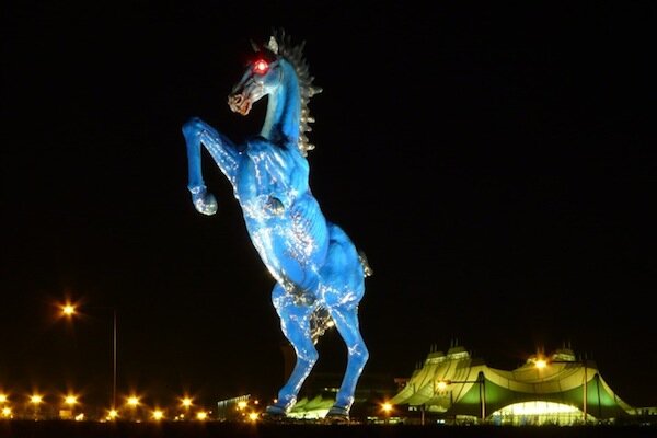 Знаете ли вы, что такое настоящая ненависть к городской скульптуре? Расскажу вам историю про одну статую, которую жители города, где она стоит, не любят настолько сильно, что церетелиевскому "Петру" и не догнать. Гигантский "Голубой Мустанг" работы скульптора Луиса Хименеса был поставлен в международном аэропорту Денвера в 2008 году. Статуя высотой в 10 метров и весом в 4 тонны выполнена из суперпрочного стекла синего цвета на металлической арматуре. Анатомическая точность очень велика, показаны даже вены с кровью. Вдобавок, у коня красные глаза с подсветкой.