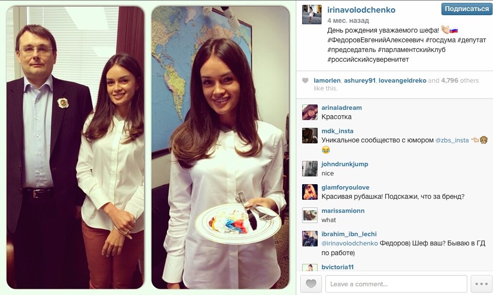 В июне 2013 года Ирина дошла до финала реалити-шоу и в этом же году начала свою карьеру на Охотном ряду, в Госдуме. Нынешняя должность звучит длинно, мутно, но солидно: руководитель аппарата межфракционного депутатского объединения "Российский суверенитет". Вот непосредственный руководитель Ирины, депутат Евгений Фёдоров: