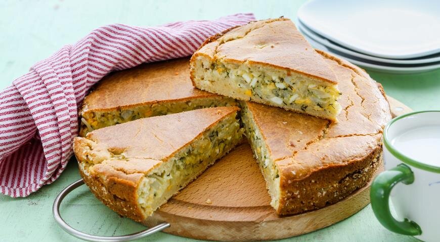 Все ингредиенты смешать (тесто должно быть по густоте, как на оладьи). Количество муки варьируется в зависимости от качества. Затем в форму для выпечки выложить половину теста. На тесто выложить начинку картофель или жареные грибы, рыбные консервы, или отварное яйцо, измельчённое с зелёным луком и т.п. Начинка может быть различной по вкусу. Сверху распределить вторую половину теста, разровнять при помощи ложки. Затем пирог отправить в духовку. Выпекать при температуре 160-180 градусов до румяной корочки.