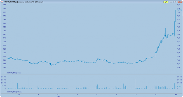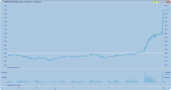 Сегодня доллар-рубль открылся небольшой коррекций к вчерашнему росту, но через пять минут торгов снова развернулся вверх и за следующие 40 минут торгов сделал еще +3 рубля вверх.