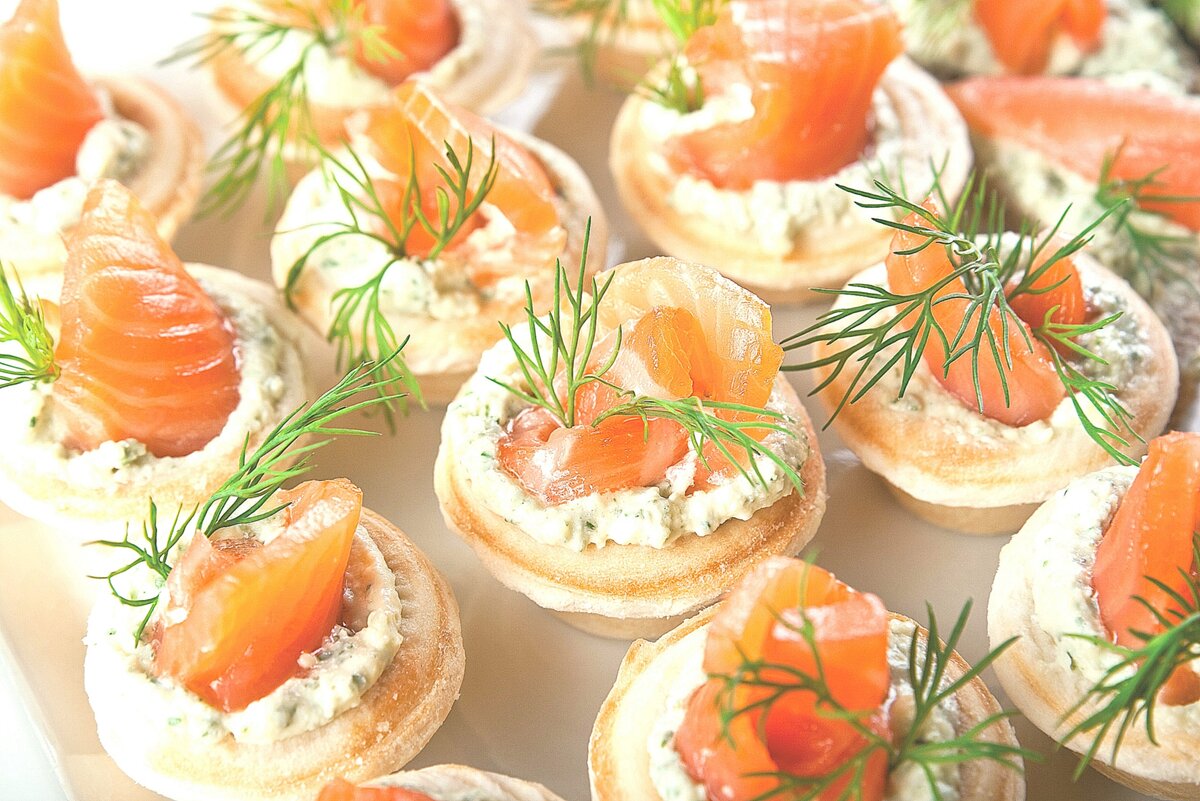 Ингредиенты: 20 шт тарталеток; 200 грамм семги; Соленные корнишоны; 2-3 куриных яйца; майонезный соус; 2-3 плавленных сырка. Отварные яйца и сыр натереть на меркой терке, корнишоны мелко покрошить, все смешать с майонезом и украсить пластиночками семги. Оставить в холодильнике на 30 минут. К таким тарталеткам очень вкусно будет если мы добавим красную икру. Приятного аппетита!