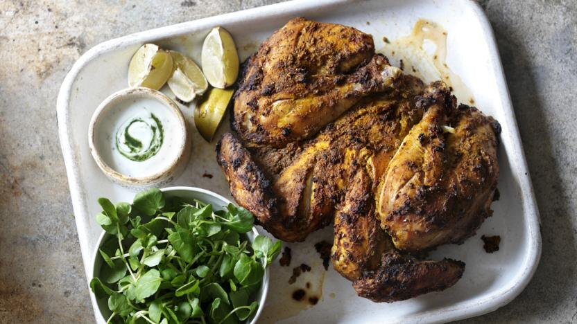 - Разогрейте духовку до 200C / 400F / Gas 6. Выньте цыпленка из тарелки и поместите его на стойку внутри большого поддона для выпечки, с грудкой вверх. Сожмите немного сока из лайма и приправьте молотым черным перцем.